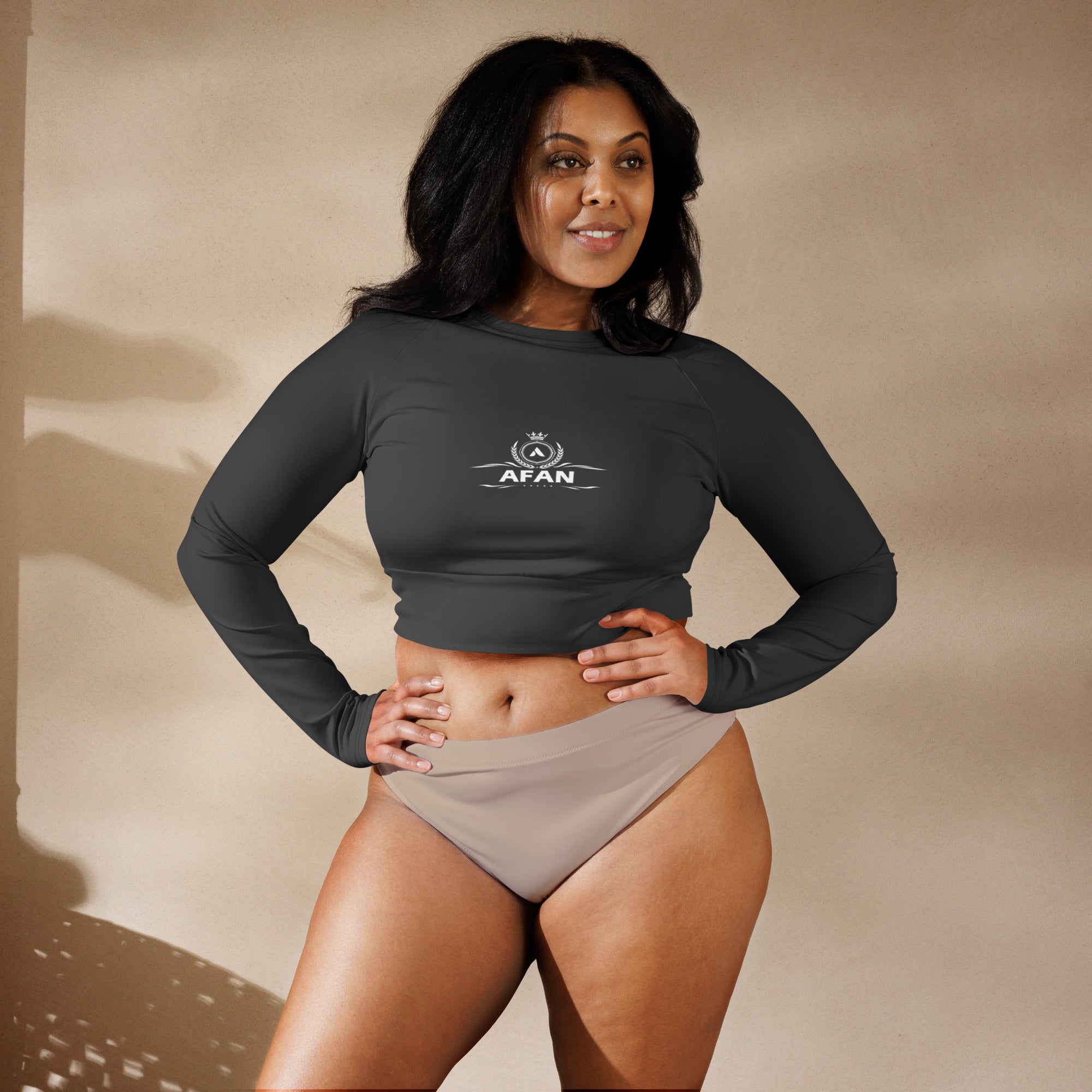 This long-sleeve crop top is made of recycled polyester and elastane, making it an eco-friendly choice for swimming, sports, or athleisure outfits. The crop top has a tear-away care label and a wide, double-layered waistline band for a comfortable fit.